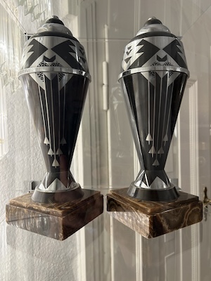 Die beiden vasenförmigen Dekoobjekte sind in einem typischen, grafischen Art Déco Muster in schwarzem Lack und Versilberungen gestaltet. Sie ruhen auf Marmorsockeln.